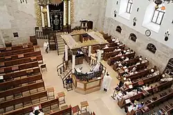 In 2002 the Israeli mint issued a set of medals featuring the synagogue to mark the beginning of the reconstruction project.[61] Following comprehensive historic research, the reconstruction works began in 2005 and on February 15, 2007, Simcha HaKohen Kook[62] of Rehovot was appointed as its rabbi, a move confirmed by leading rabbis, including Yosef Shalom Eliashiv.[63] On April 15, 2008 a celebration marked the placing of the keystone in the synagogue's dome.[16] Following Simcha HaKohen Kook's death, Rabbi Eliyahu Zilberman, rosh yeshiva of Yeshivat Aderet Eliyahu, was appointed rabbi of the synagogue.[64]