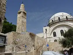 It was originally founded in the early 18th century by followers of Judah HeHasid on the ruins of a 15th century synagogue and adjacent to the 14th century Sidna Omar mosque, but it was destroyed in 1721 by local lenders over a debt dispute.[4] The plot became known as "The Ruin", or Hurva, where it lay desolate for 116 years until it was resettled in 1837 by members of the Ashkenazi Jewish community, known as the Perushim.[5] In 1856, the Ottoman Sultan Abdelmecid issued a firman authorizing the construction of a synagogue at the site, and the sultan's chief architect, Assad Bey, designed it and oversaw its construction.[6] Construction began in 1864, and although officially named the Beis Yaakov Synagogue, it retained its name as the Hurva. It became Jerusalem's main Ashkenazi synagogue, until it was destroyed on May 27, during the fighting of the 1948 Arab–Israeli War.[7] Israel claims Arabs deliberately destroyed it,[8] while Jordanian and Palestinian sources state the Jordanian army was forced to shell the synagogue after the Zionist forces used its high rooftops for military purposes.[6]
