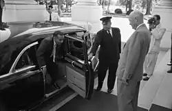 Suhrawardy in 1957 described Pakistan's foreign policy as "friendship towards all and malice towards none", a phrase which was later adopted as Bangladesh's foreign policy.[42][43] Suhrawardy is also considered to be one of the pioneers of Pakistan's foreign policy aimed, directed, and set towards excessively supporting the United States and their cause, a policy that was pursued by the successive administrations.[44] On 10 July 1957, Prime Minister Suhrawardy paid an official visit to the United States where he met with President Dwight Eisenhower. Suhrawardy accepted Eisenhower's request to lease a base in Pakistan from which the United States Air Force could gather intelligence about the Soviet Union. In return, the United States distributed $2.142 billion in aid to Pakistan, including supersonic F-104 Starfighters and M48 Patton tanks.[45] Suhrawardy's party, the Awami League, split over his signing of the US-Pakistan military pact, with Maulana Bhasani leaving to form the National Awami Party (NAP).[46] The 1960 U-2 incident severely compromised the national security of Pakistan when Soviet Union eventually discovered the base through interrogating its pilot.