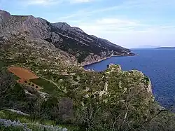 Hvar is a high east–west ridge of Mesozoic limestone and dolomite, which was part of the mainland until approximately 11,000 years ago. Around that time, sea levels rose, filling the valleys that are now the channels between the islands.[9] Hvar has a typical karst landscape, which means limited or no surface water, despite adequate rainfall, which disappears quickly into crevices in the ground. Farming in such areas requires careful conservation of water and protection of the soil against erosion. The water cisterns in the fields, and the dry-stone walls, especially terracing on the slopes are necessary for the continued success of agriculture on the island.[10]