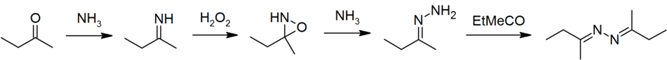 - 2 (CH3)2CO + N2H4 → 2 H2O + ((CH3)2C=N)2