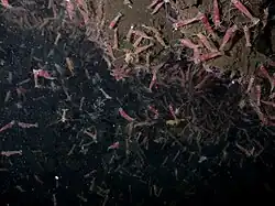 Giant tube worms at the base of a hydrothermal mount