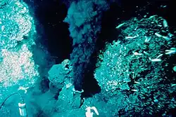 High temperature hydrothermal vents, the "black smokers", were discovered in spring 1979 by a team from the Scripps Institution of Oceanography using the submersible Alvin. The RISE expedition explored the East Pacific Rise at 21° N with the goals of testing geophysical mapping of the sea floor with the Alvin and finding another hydrothermal field beyond the Galápagos Rift vents. The expedition was led by Fred Spiess and Ken Macdonald and included participants from the U.S., Mexico and France.[18] The dive region was selected based on the discovery of sea floor mounds of sulfide minerals by the French CYAMEX expedition in 1978.[98] Prior to dive operations, expedition member Robert Ballard located near-bottom water temperature anomalies using a deeply towed instrument package. The first dive was targeted at one of those anomalies. On Easter Sunday April 15, 1979 during a dive of Alvin to 2,600 meters, Roger Larson and Bruce Luyendyk found a hydrothermal vent field with a biological community similar to the Galápagos vents. On a subsequent dive on April 21, William Normark and Thierry Juteau discovered the high temperature vents emitting black mineral particle jets from chimneys; the black smokers.[99] Following this Macdonald and Jim Aiken rigged a temperature probe to Alvin to measure the water temperature at the black smoker vents. This observed the highest temperatures then recorded at deep sea hydrothermal vents (380±30 °C).[100] Analysis of black smoker material and the chimneys that fed them revealed that iron sulfide precipitates are the common minerals in the "smoke" and walls of the chimneys.[101]