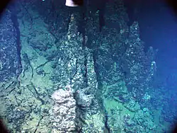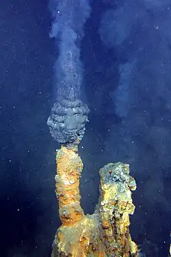 A black smoker or deep-sea vent is a type of hydrothermal vent found on the seabed, typically in the bathyal zone (with largest frequency in depths from 2,500 to 3,000 m (8,200 to 9,800 ft)), but also in lesser depths as well as deeper in the abyssal zone.[1] They appear as black, chimney-like structures that emit a cloud of black material. Black smokers typically emit particles with high levels of sulfur-bearing minerals, or sulfides. Black smokers are formed in fields hundreds of meters wide when superheated water from below Earth's crust comes through the ocean floor (water may attain temperatures above 400 °C (752 °F)).[1] This water is rich in dissolved minerals from the crust, most notably sulfides. When it comes in contact with cold ocean water, many minerals precipitate, forming a black, chimney-like structure around each vent. Chimneys thicken due to heat conduction encouraging crystallization.[16] The deposited metal sulfides can become massive sulfide ore deposits in time. Some black smokers along the Azores segment of the Mid-Atlantic Ridge are exceptionally metal-rich; for instance, hydrothermal fluids from the Rainbow Vent Field contain up to 24,000 μM of dissolved iron.[17]