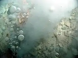 Carbon dioxide bubbles are emitted from white smokers at the Champagne vent site in Eifuku.