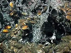 Shrimp (Alvinocaris), a few squat lobsters, and hundreds of bivalves (Bathymodiolus)