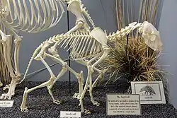 Hyenas have relatively short torsos and are fairly massive and wolf-like in build, but have lower hind quarters, high withers and their backs slope noticeably downward towards their rumps. The forelegs are high, while the hind legs are very short and their necks are thick and short. Their skulls superficially resemble those of large canids, but are much larger and heavier, with shorter facial portions. Hyenas are digitigrade, with the fore and hind paws having four digits each and sporting bulging pawpads.[34] Like canids, hyenas have short, blunt, non-retractable claws.[35] Their pelage is sparse and coarse with poorly developed or absent underfur. Most species have a rich mane of long hair running from the withers or from the head.[34] With the exception of the spotted hyena, hyaenids have striped coats, which they likely inherited from their viverrid ancestors.[7] Their ears are large and have simple basal ridges and no marginal bursa.[35] Their vertebral columns, including the cervical region, are of limited mobility. Hyenas have no baculum.[36] Hyenas have one more pair of ribs than canids do, and their tongues are rough like those of felids and viverrids.[37] Males in most hyena species are larger than females,[38] though the spotted hyena is an exception, as it is the female of the species that outweighs and dominates the male. Also, unlike other hyenas, the female spotted hyena's external genitalia closely resembles that of the male.[39]