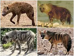 | The four extant species of hyena, clockwise from upper left: spotted hyena (Crocuta crocuta), brown hyena (Parahyaena brunnea), aardwolf (Proteles cristata), and striped hyena (Hyaena hyaena) | |