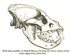 Their dentition is similar to that of the canid, but is more specialised for consuming coarse food and crushing bones. The carnassials, especially the upper, are very powerful and are shifted far back to the point of exertion of peak pressure on the jaws. The other teeth, save for the underdeveloped upper molars, are powerful, with broad bases and cutting edges. The canines are short, but thick and robust.[36] Labiolingually, their mandibles are much stronger at the canine teeth than in canids, reflecting the fact that hyenas crack bones with both their anterior dentition and premolars, unlike canids, which do so with their post-carnassial molars.[40] The strength of their jaws is such that both striped and spotted hyenas have been recorded to kill dogs with a single bite to the neck without breaking the skin.[41][42] The spotted hyena is renowned for its strong bite proportional to its size, but a number of other animals (including the Tasmanian devil) are proportionately stronger.[43][44] The aardwolf has greatly reduced cheek teeth, sometimes absent in the adult, but otherwise has the same dental formula as the other three species.[45] The dental formula for all hyena species is: 3.1.4.13.1.3.1