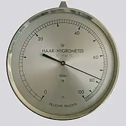 A hair tension dial hygrometer with a nonlinear scale.