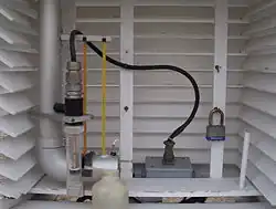 The interior of a Stevenson screen showing a motorized psychrometer