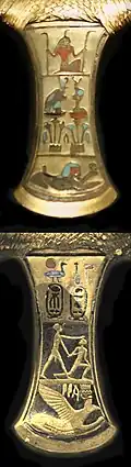 The Hyksos period marks the first in which foreign rulers ruled Egypt.[12] Many details of their rule, such as the true extent of their kingdom and even the names and order of their kings, remain uncertain. The Hyksos practiced many Levantine or Canaanite customs alongside Egyptian ones.[13] They have been credited with introducing several technological innovations to Egypt, such as the horse and chariot, as well as the khopesh (sickle sword) and the composite bow, a theory which is disputed.[14]