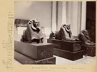 The so-called "Hyksos sphinxes" or "Tanite sphinxes" are a group of royal sphinxes depicting the earlier pharaoh Amenemhat III (Twelfth Dynasty) with some unusual traits compared to conventional statuary, for example prominent cheekbones and the thick mane of a lion, instead of the traditional nemes headcloth. The name "Hyksos sphinxes" was given due to the fact that these were later reinscribed by several of the Hyksos kings, and were initially thought to represent the Hyksos kings themselves. Nineteenth-century scholars attempted to use the statues' features to assign a racial origin to the Hyksos.[168] These Sphinxes were seized by the Hyksos from cities of the Middle Kingdom and then transported to their capital Avaris where they were reinscribed with the names of their new owners and adorned their palace.[161] Seven of those sphinxes are known, all from Tanis, and now mostly located in the Cairo Museum.[161][169] Other statues of Amenehat III were found in Tanis and are associated with the Hyksos in the same manner.