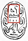 Based on the use of the name in a Hyksos inscription of Sakir-Har from Avaris, the name was used by the Hyksos as a title for themselves.[36] However, Kim Ryholt argues that "Hyksos" was not an official title of the rulers of the Fifteenth Dynasty, and is never encountered together with royal titulary, only appearing as the title in the case of Sakir-Har. According to Ryholt, "Hyksos" was a generic term encountered separately from royal titulary, and in regnal lists after the end of the Fifteenth Dynasty itself.[37] However, Vera Müller writes: "Considering that S-k-r-h-r is also mentioned with three names of the traditional Egyptian titulary (Horus name, Golden Falcon name and Two Ladies name) on the same monument, this argument is somehow strange."[38] Danielle Candelora and Manfred Bietak also argue that the Hyksos used the title officially.[6][39] All other texts in the Egyptian language do not call the Hyksos by this name, instead referring to them as Asiatics (ꜥꜣmw), with the possible exception of the Turin King List in a hypothetical reconstruction from a fragment.[40] The title is not attested for the Hyksos king Apepi, possibly indicating an "increased adoption of Egyptian decorum".[41] The names of Hyksos rulers in the Turin list are without the royal cartouche and have the throwstick "foreigners" determinative.[42]