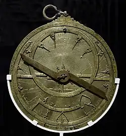 One of Synesius's letters describes Hypatia as having taught him how to construct a silver plane astrolabe as a gift for an official.[52][144][145][146] An astrolabe is a device used to calculate date and time based on the positions of the stars and planets. It can also be used to predict where the stars and planets will be on any given date.[144][147][148] A "little astrolabe", or "plane astrolabe", is a kind of astrolabe that used stereographic projection of the celestial sphere to represent the heavens on a plane surface, as opposed to an armillary sphere, which was globe-shaped.[129][147] Armillary spheres were large and normally used for display, whereas a plane astrolabe was portable and could be used for practical measurements.[147]
