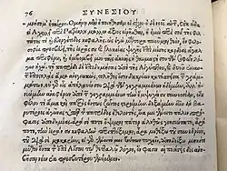 According to Watts, two main varieties of Neoplatonism were taught in Alexandria during the late fourth century. The first was the overtly pagan religious Neoplatonism taught at the Serapeum, which was greatly influenced by the teachings of Iamblichus.[40] The second variety was the more moderate and less polemical variety championed by Hypatia and her father Theon, which was based on the teachings of Plotinus.[41] Although Hypatia was a pagan, she was tolerant of Christians.[42][43] In fact, every one of her known students was Christian.[44] One of her most prominent pupils was Synesius of Cyrene,[26][45][46][47] who went on to become a bishop of Ptolemais (now in eastern Libya) in 410.[47][48] Afterward, he continued to exchange letters with Hypatia[46][47][49] and his extant letters are the main sources of information about her career.[46][47][50][51][52] Seven letters by Synesius to Hypatia have survived,[46][47] but none from her addressed to him are extant.[47] In a letter written in around 395 to his friend Herculianus, Synesius describes Hypatia as "... a person so renowned, her reputation seemed literally incredible. We have seen and heard for ourselves she who honorably presides over the mysteries of philosophy."[46] Synesius preserves the legacy of Hypatia's opinions and teachings, such as the pursuit of "the philosophical state of apatheia—complete liberation from emotions and affections".[53]