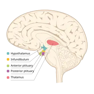 Location of the hypothalamus (cyan) in relation to the pituitary and to the rest of the brain