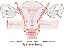 ![]() Diagram showing what is removed with a radical hysterectomy | |