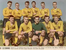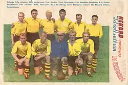 The glory days of IF Elfsborg, season 1942–43, with the team whom won three national titles. Standing from left: Gillis Andersson, Evert Grahn, Knut Johansson, Sven Jonasson, Stenholm, KE Grahn. Kneeling from left: Dahl, Hernqvist, Åke Sandberg, Arne Sandgren, Emanuelsson.