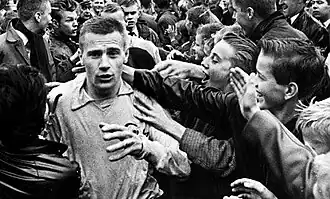 Already in the 1940s[44] there was the legendary Elfsborg chant "heja di våra, inte di dära, trampa di främmatta pöjka på tära" on Ryavallen, at the time, including of a certain young Ingvar Carlsson,[45] who later became prime minister. For a few years in the 1970s "Di Gule" played fantastic football and was in top contest of the Swedish Allsvenskan. At this time the British supporter culture retrieved from "Tipsextra" began to interfere and influence in Swedish football culture, with an impact even on Ryavallen in Borås, where the seating stand for many years was the busiest around Ryavallen and Elfsborg. A young supporter section was formed later on within Elfsborgs fanclub and the culture of being on the standing ground began to arise all along with the contemporary characteristic hat and striped scarf in Elfsborgs colours yellow and black. In the coming years, there was a small and disorganized supporter group who failed to make a big fuss.[46]