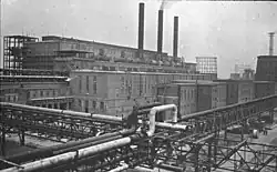 IG Farben has been described as "the most notorious German industrial concern during the Third Reich".[10] When World War II began, it was the fourth largest corporation in the world and the largest in Europe.[36] In February 1941, Reichsführer-SS Heinrich Himmler signed an order[37] supporting the construction of an IG Farben Buna-N (synthetic rubber) plant—known as Monowitz Buna Werke (or Buna)—near the Monowitz concentration camp, part of the Auschwitz concentration camp complex in German-occupied Poland. (Monowitz came to be known as Auschwitz III; Auschwitz I was the administrative centre and Auschwitz II-Birkenau the extermination camp.) The IG Farben plant's workforce consisted of slave labour from Auschwitz, leased to the company by the SS for a low daily rate.[38] One of IG Farben's subsidiaries supplied the poison gas, Zyklon B, that killed over one million people in gas chambers.[39]