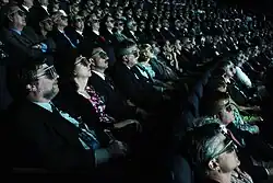 IMAX theatres are described as either "Classic Design" (purpose-built structures), or "Multiplex Design" (retro-fitted auditoriums).[59] Classic IMAX theatre construction differs significantly from conventional theatres. The increased resolution lets the audience be much closer to the screen. Typically, all rows are within one screen height – conventional theatre seating runs 8 to 12-screen heights. Also, the rows of seats are set at a steep angle (up to 30° in some domed theatres) so that the audience is facing the screen directly.[60]