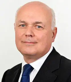 Sir George Iain Duncan Smith (born 9 April 1954), often referred to by his initials IDS, is a British politician who was Leader of the Conservative Party and Leader of the Opposition from 2001 to 2003. He was Secretary of State for Work and Pensions from 2010 to 2016. He has been Member of Parliament (MP) for Chingford and Woodford Green, formerly Chingford, since 1992.