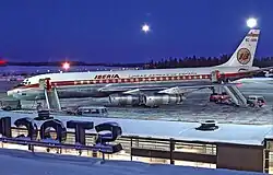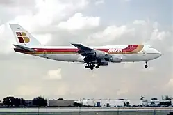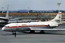 In 1961, Iberia had 9 Super Constellations in the fleet, that year came into service the first DC-8-50, the four-engined jet airliner was progressively incorporated until reaching the number of 8 aircraft of the 50 series variant.[33] Iberia was gradually incorporating jets of short and middle range, such as Sud Aviation Caravelle, and Douglas DC-9. The Super Constellations were removed and sold in 1966, and two years later, three DC-8-63 with more seat capacity were incorporated into the fleet. By 1969, the long-range fleet of Iberia was composed of 11 DC-8s.[33] In the early 1970s, the jumbo jets Boeing 747s and Douglas DC-10s came to the company during an expansion of the intercontinental routes, especially to Central America. By the middle of this decade, the airline flew to almost all Latin American capitals. With the expansion in Latin America the company had followed a policy of purchasing shares and establishing agreements with several Latin American airlines such as Compañia Dominicana de Aviación, Aérolíneas Peruanas, PLUNA and Air Panamá Internacional. At first, the intention of this policy could be to create a strong distribution network for intercontinental routes passengers, but as the airline was controlled by the state the Franco regime used this investment policy to get support in Latin America. Iberia gave material, capital and logistical support to those flag-carrier airlines. By 1971, these investments resulted in the loss of 14 million dollars.[34] Iberia also bought the short-middle range trijet Boeing 727-200 in 1971, of which the company had 35 aircraft[35] and was used until 2001 like the other short-range jet bought by the company in the late '60s, the Douglas DC-9.[36]