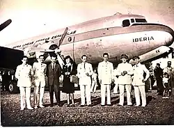 Iberia incorporated four more DC-4s into its fleet during the first half of 1950, enabling both the strengthening of current services and the launch of new ones.[25] With the Pact of Madrid in 1953, visa requirements were eliminated for US visitors to Spain.[26] This stimulated the start of transatlantic flights between Spain and the United States the following year. The airline phased in the first of three Super Constellations in June 1954. The aircraft was named Santa María to commemorate Columbus' first voyage[27] and was deployed in the inauguration of the new Madrid–New York service two months later, on 3 August 1954, the same day that Columbus left the port of Palos de la Frontera.[28][29] The amendments to Article 6 of the Convention on International Civil Aviation of 14 June 1954 made in Paris on 30 June 1956 about non-scheduled air services enabled mass tourism using chartered aircraft since allowing European member states to carry out this type of operation with international flights between their territories.[30] This favoured the airline given that it had in its territory several highly sought after destinations, mainly those on the eastern and southern Mediterranean coast and in the Balearic and Canary Islands, highly demanded by seaside tourism which began with this type of operation.