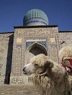 Bactrian camel (one of the symbols of Silk Road caravans) in front of Mausoleum of Khoja Ahmed Yasawi in the city of Turkestan, Kazakhstan