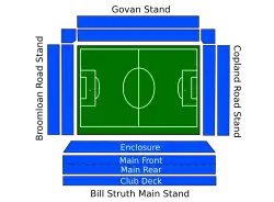 The Ibrox pitch is surrounded by four covered all-seater stands, officially known as the Bill Struth Main (south), Broomloan Road (west), Sandy Jardine (north) and Copland Road (east) Stands.[25] Each stand has two tiers, with the exception of the Bill Struth Main Stand, which has had three tiers since the Club Deck was added in 1991.[6][25] The two corner areas, known as the West and East areas of the Sandy Jardine Stand, have one tier of seating below a JumboTron screen.[6][25]