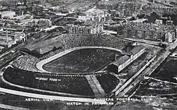 Rangers first moved to the Ibrox area later in 1887, playing on a site immediately to the east of the current stadium.[5][6] The first match at this stadium was an 8–1 defeat to English side Preston North End on 20 August 1887, watched by a capacity crowd of over 15,000.[5][6] This inaugural match had to be abandoned after 70 minutes due to a pitch invasion.[6][7] The first Ibrox Park was a success in the short term, as three Scotland international matches and the 1890 Scottish Cup Final were played at the ground.[5][8] Celtic Park, built in 1892, was more advanced, however.[5] Rangers opted to construct a new stadium, raising funds by forming a limited company.[6] The last match at the old ground was played on 9 December 1899.[5] The new Ibrox Park was formally opened with a 3–1 victory over Hearts on 30 December.[5][6]