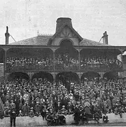 The structure was passed by the Govan Burgh Surveyor in March 1902, but there were newspaper reports that it was unstable.[5] A crowd of 68,114 assembled for a Scotland v England match on 5 April 1902, but shortly after the kick-off one section of the terracing "collapsed like a trap door".[5] A gap of 20 square yards appeared, causing about 125 people to fall to the ground 50 feet below the terracing.[5] Most survived due to the fact they fell on top of other bodies, but 25 people were killed.[5][10][11] 517 people were injured, some due to being crushed in the panic caused by the collapse.[5][10]