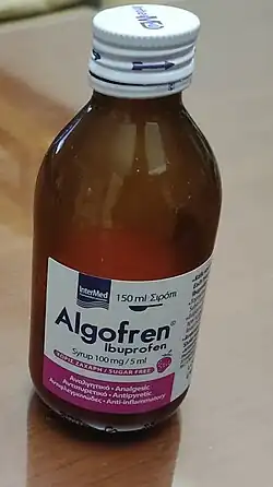 A 150 ml bottle (100 mg/5 ml dosage) of ibuprofen, sold in Greece