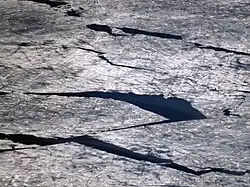 Frozen landscape in the Northwest Territories of Canada. A large ice circle can be clearly seen floating on water.[40][41]