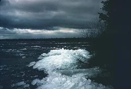 Ice forms on calm water from the shores, a thin layer spreading across the surface, and then downward. Ice on lakes is generally four types: primary, secondary, superimposed and agglomerate.[67][68] Primary ice forms first. Secondary ice forms below the primary ice in a direction parallel to the direction of the heat flow. Superimposed ice forms on top of the ice surface from rain or water which seeps up through cracks in the ice which often settles when loaded with snow. An ice shove occurs when ice movement, caused by ice expansion and/or wind action, occurs to the extent that ice pushes onto the shores of lakes, often displacing sediment that makes up the shoreline.[69]