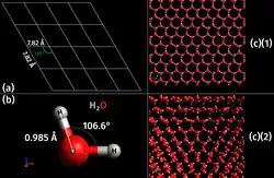 The three-dimensional crystal structure of H2O ice Ih (c) is composed of bases of H2O ice molecules (b) located on lattice points within the two-dimensional hexagonal space lattice (a).[4][5]