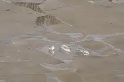 Permafrost is soil or underwater sediment which continuously remains below 0 °C (32 °F) for two years or more.[59] The ice within permafrost is divided into four categories: pore ice, vein ice (also known as ice wedges), buried surface ice and intrasedimental ice (from the freezing of underground waters).[60] One example of ice formation in permafrost areas is aufeis – layered ice that forms in Arctic and subarctic stream valleys. Ice, frozen in the stream bed, blocks normal groundwater discharge, and causes the local water table to rise, resulting in water discharge on top of the frozen layer. This water then freezes, causing the water table to rise further and repeat the cycle. The result is a stratified ice deposit, often several meters thick.[61] Snow line and snow fields are two related concepts, in that snow fields accumulate on top of and ablate away to the equilibrium point (the snow line) in an ice deposit.[62]