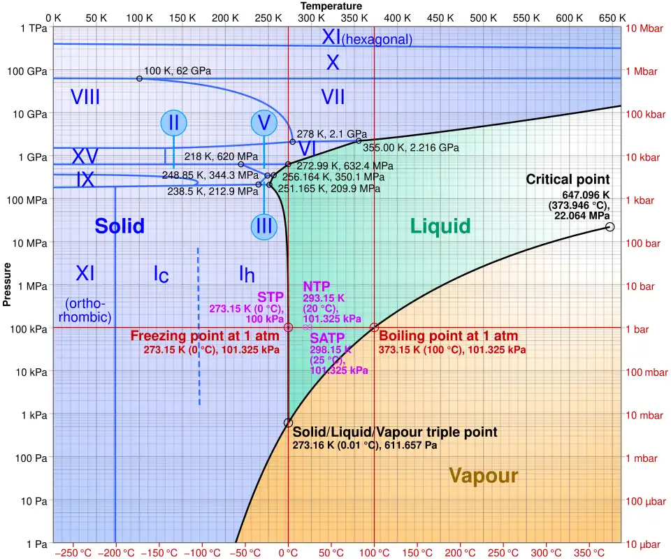 Log-lin pressure-temperature phase diagram of water. The Roman numerals correspond to some ice phases listed below.