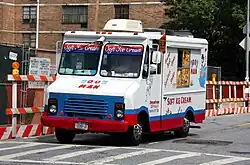 Some ice cream distributors sell ice cream products from travelling refrigerated vans or carts (commonly referred to in the US as "ice cream trucks"), sometimes equipped with speakers playing children's music or folk melodies (such as "Turkey in the Straw"). The driver of an ice cream van drives throughout neighbourhoods and stops every so often, usually every block. The seller on the ice cream van sells the ice cream through a large window; this window is also where the customer asks for ice cream and pays. Ice cream vans in the United Kingdom make a music box noise rather than actual music.