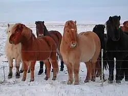 The breed comes in many coat colours, including chestnut, dun, bay, black, gray, palomino, pinto and roan, as well as bicolour/pied with large black/brown blotches over a white coat. There are over 100 names for various colors and color patterns in the Icelandic language.[3][4] They have well-proportioned heads, with straight profiles and wide foreheads. The neck is short, muscular, and broad at the base; the withers broad and low. The chest is deep; the shoulders are muscular and slightly sloping and the back is long. The croup is broad, muscular, short and slightly sloping. The legs are strong and short, with relatively long cannon bones and short pasterns. The mane and tail are full, with coarse hair, and the tail is set low. The breed is known to be hardy and an easy keeper.[9] The breed has a double coat developed for extra insulation in cold temperatures.[10]