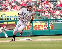Suzuki had 213 hits in 2008, his eighth straight 200-hit season. This tied the 107-year-old record set by Wee Willie Keeler.[55] Typically, Suzuki was among baseball's leaders in reaching base on an error (14 times in 2008, more than any other batter in the AL), and in infield hits (his 56 were the most in the majors).[56] Suzuki amassed an estimated 694 infield hits in his U.S. career.[57] Detroit third baseman Brandon Inge told The New York Times, "I wish you could put a camera at third base to see how he hits the ball and see the way it deceives you. You can call some guys' infield hits cheap, but not his. He has amazing technique."[58] In May 2008, Suzuki stole two bases, giving him a career total of 292, surpassing the previous Seattle Mariners team record of 290 set by second baseman Julio Cruz. Cruz, who worked on Spanish-language broadcasts of Mariners games at the time, was watching from the broadcast booth as Suzuki broke his record.[59][60]