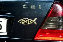The ichthys or ichthus (/ˈɪkθəs/; from Greek ἰχθύς, "fish"[1]) is, in its modern rendition, a symbol consisting of two intersecting arcs, the right ends extending beyond the meeting point so as to resemble the profile of a fish. It has been speculated that the symbol was used by early Christians as a secret symbol: a shibboleth to determine if another was indeed Christian.[2][3] It is now known colloquially as the "Jesus fish".[4] This symbol is widely used by Christians as a sign of their faith, often being found on vehicles, necklaces and laptop stickers.[5]