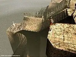 Escaping the castle is made difficult by shadow creatures sent by the Queen. These creatures attempt to drag Yorda into black vortexes if Ico leaves her for any length of time, or if she is in certain areas of the castle. Ico can dispel these shadows using a stick or sword, as well as free Yorda if she is drawn into a vortex.[4] While the shadow creatures cannot harm Ico, the game is over if Yorda becomes fully engulfed in a vortex; the player must then restart from a save point. The player will also restart from a save point if Ico falls from a large height. Save points in the game are represented by stone benches that Ico and Yorda rest on as the player saves the game.[7] In the European and Japanese releases, upon completion of the game, the player can restart the game in a local co-operative two-player mode; the second player plays as Yorda, under the same limitations as the computer-controlled version of the character. The new game mode also adds subtitles that translate Yorda's fictional language.[8][9]
