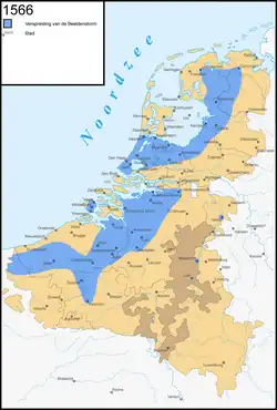 The Seventeen Provinces (now the Netherlands, Belgium, and parts of Northern France) were disrupted by widespread Calvinist iconoclasm in the summer of 1566.[35]