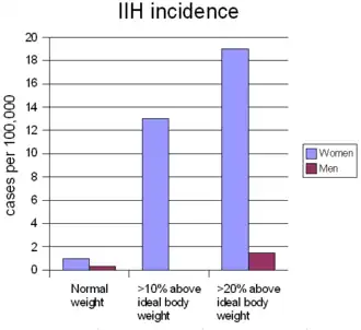 On average, IIH occurs in about one per 100,000 people, and can occur in children and adults. The median age at diagnosis is 30. IIH occurs predominantly in women, especially in the ages 20 to 45, who are four to eight times more likely than men to be affected. Overweight and obesity strongly predispose a person to IIH: women who are more than ten percent over their ideal body weight are thirteen times more likely to develop IIH, and this figure goes up to nineteen times in women who are more than twenty percent over their ideal body weight. In men this relationship also exists, but the increase is only five-fold in those over 20 percent above their ideal body weight.[5]