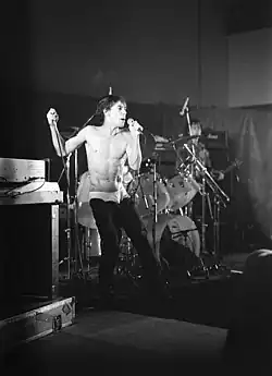 Initially playing a raw, primitive style of rock and roll (progressing later towards more experimental and aggressive rock), the Stooges sold few records in their original incarnation and gained a reputation for their confrontational performances, which sometimes involved acts of self-mutilation by Pop.[8] He had a long collaborative relationship and friendship with David Bowie over the course of his career, beginning with the Stooges' album Raw Power in 1973. Both musicians went to West Berlin to wean themselves off their respective drug addictions and Pop began his solo career by collaborating with Bowie on the 1977 albums The Idiot and Lust for Life, Pop usually contributing the lyrics. He was one of the first performers to do a stage-dive and popularized the activity.[9][10] Pop, who traditionally (but not exclusively) performs bare-chested, also performed such stage theatrics as rolling around in broken glass.