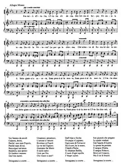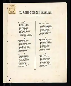 "Il Canto degli Italiani",[a] is a patriotic song written by Goffredo Mameli and set to music by Michele Novaro in 1847,[2] currently used as the national anthem of Italy. It is known among Italians as the "Inno di Mameli"[b]—after the author of the lyrics, or "Fratelli d'Italia"[c]—from the song's opening line. The piece, in 4