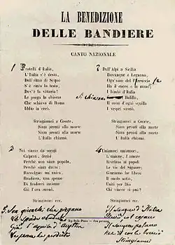 Novaro's autographed manuscript to the publisher Francesco Lucca is located in the Ricordi Historical Archive.[24] The later Istituto Mazziniano sheet lacks the final strophe ("Son giunchi che piegano…") for fear of censorship. These leaflets were to be distributed at the 10 December demonstration in Genoa.[25] The hymn was also printed on leaflets in Genoa, by the printer Casamara.