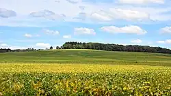 American Indians of successive cultures lived along the waterways of the Illinois area for thousands of years before the arrival of Europeans. The Koster Site has been excavated and demonstrates 7,000 years of continuous habitation. Cahokia, the largest regional chiefdom and Urban Center of the Pre-Columbian Mississippian culture, was located near present-day Collinsville, Illinois. They built an urban complex of more than 100 platform and burial mounds, a 50-acre (20 ha) plaza larger than 35 football fields,[19] and a woodhenge of sacred cedar, all in a planned design expressing the culture's cosmology. Monks Mound, the center of the site, is the largest Pre-Columbian structure north of the Valley of Mexico. It is 100 ft (30 m) high, 951 ft (290 m) long, 836 ft (255 m) wide, and covers 13.8 acres (5.6 ha).[20] It contains about 814,000 cu yd (622,000 m3) of earth.[21] It was topped by a structure thought to have measured about 105 ft (32 m) in length and 48 ft (15 m) in width, covered an area 5,000 sq ft (460 m2), and been as much as 50 ft (15 m) high, making its peak 150 ft (46 m) above the level of the plaza. The finely crafted ornaments and tools recovered by archaeologists at Cahokia include elaborate ceramics, finely sculptured stonework, carefully embossed and engraved copper and mica sheets, and one funeral blanket for an important chief fashioned from 20,000 shell beads. These artifacts indicate that Cahokia was truly an urban center, with clustered housing, markets, and specialists in toolmaking, hide dressing, potting, jewelry making, shell engraving, weaving and salt making.[22]